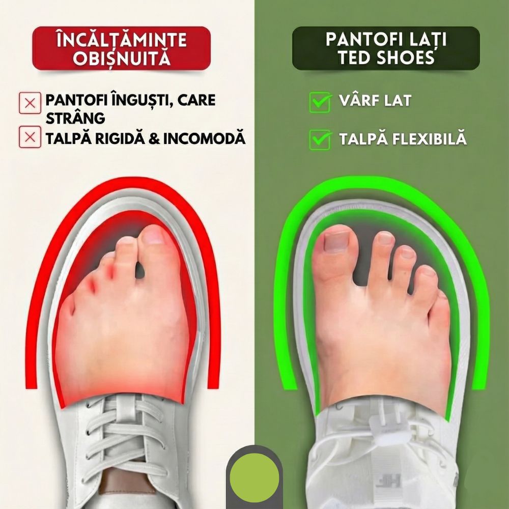 Modelul Ted TB100 nu este doar un pantof, ci o soluție pentru un mers sănătos. Spre deosebire de încălțămintea obișnuită care strânge degetele și duce la o postură deficitară, designul nostru anatomic respectă forma naturală a piciorului.